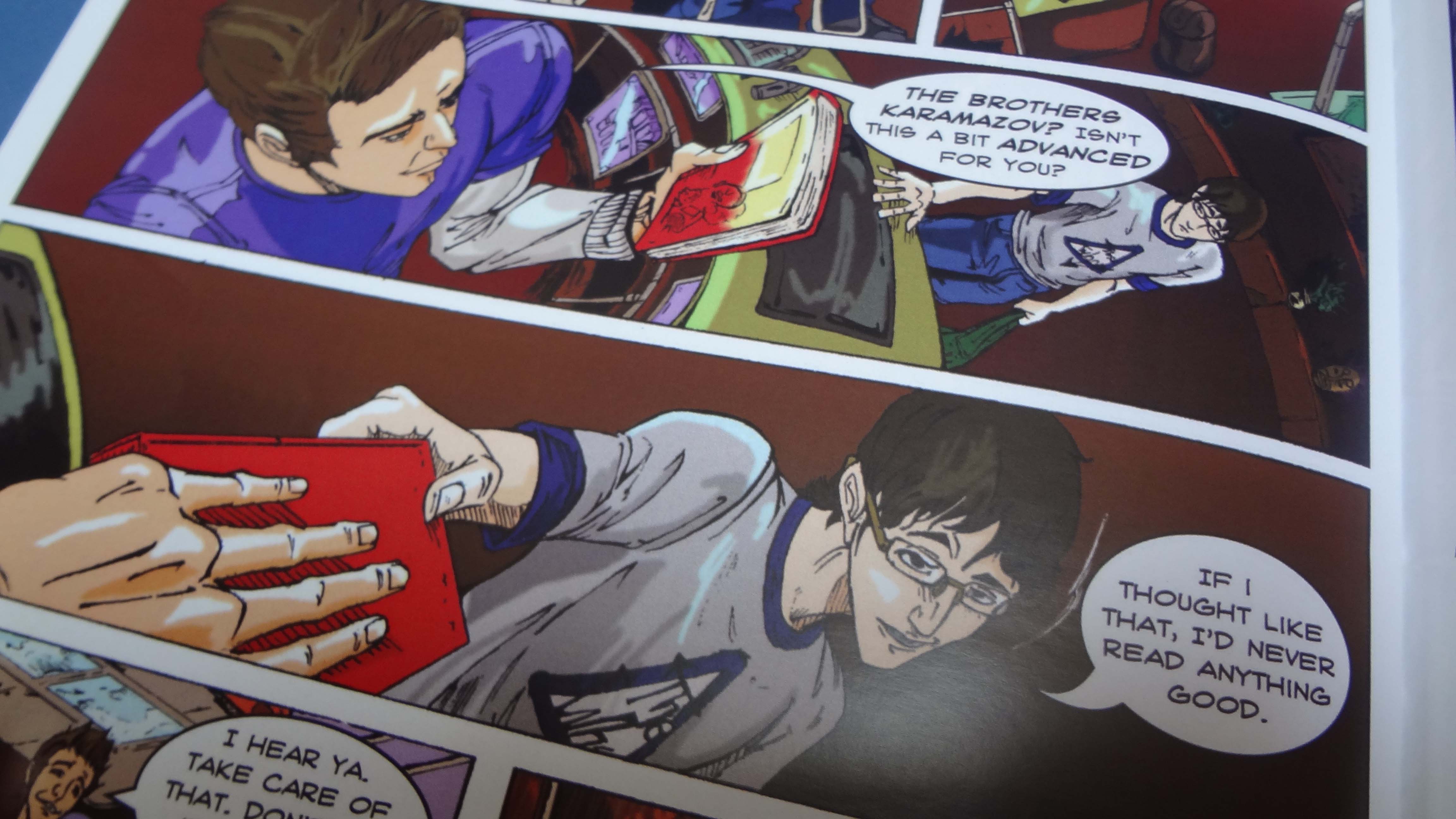 En cuanto a la historia, como he dicho antes, promete. Quizá para algunos el ritmo sea lento, pero creo que dice lo que tiene que decir en un primer número. No le falta ni le sobra nada. Las primeras páginas te dan idea de a qué se enfrentarán los protagonistas sin dejar la intriga, y el resto nos introduce la situación en la que se encuentran en esta parte de su vida que es la preparatoria. Tampoco es difícil identificarse con ellos: tenemos a Nate, el chico serio pero genial que va a su propio ritmo, Eddy (hasta ahora mi favorito), chico de lentes amante de la buena literatura, quien además ha dicho el mejor diálogo en este número; y finalmente Carter, algo así como el hermano mayor y gamer del grupo. Por otro lado, el antagonista ya se perfila para dar batalla y unos buenos discursos.